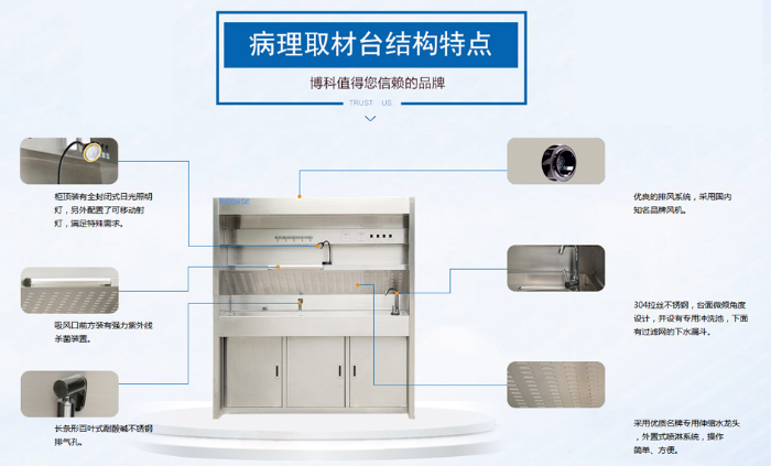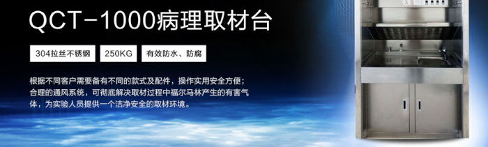 取材台是病理实验室中非常重要的安全设备之一,采用304不锈钢材料制作,可有效防水、防腐,根据不同客户需要备有不同的款式及配件,操作实用安全方便;合理的通风系统,可解决取材过程中福尔马林产生的有害气体,为实验人员提供一个洁净安全的取材环境。