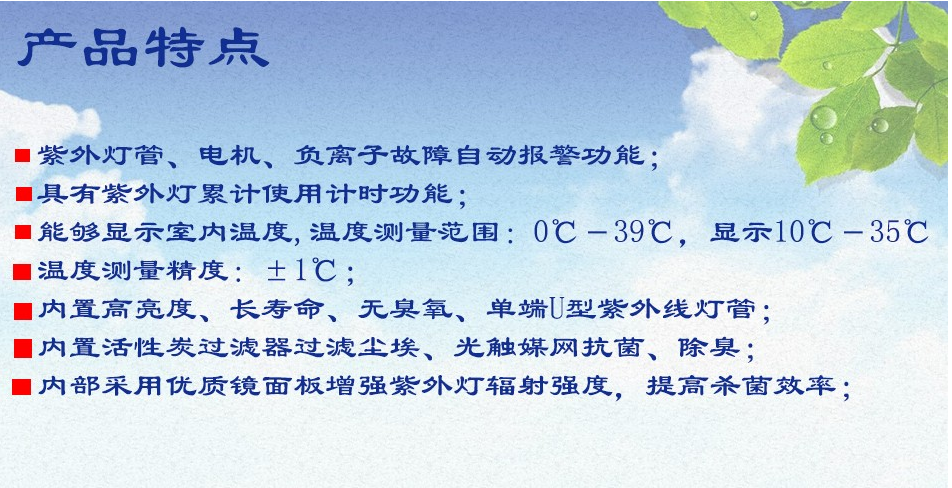 空气消毒机采用高强度型紫外线杀菌灯,负离子发生器、等离子发生器、臭氧发生器,活性炭过滤消毒方式可用于有人在条件下的空气消毒(无臭氧时),壁挂不占用空间,配备遥控器。