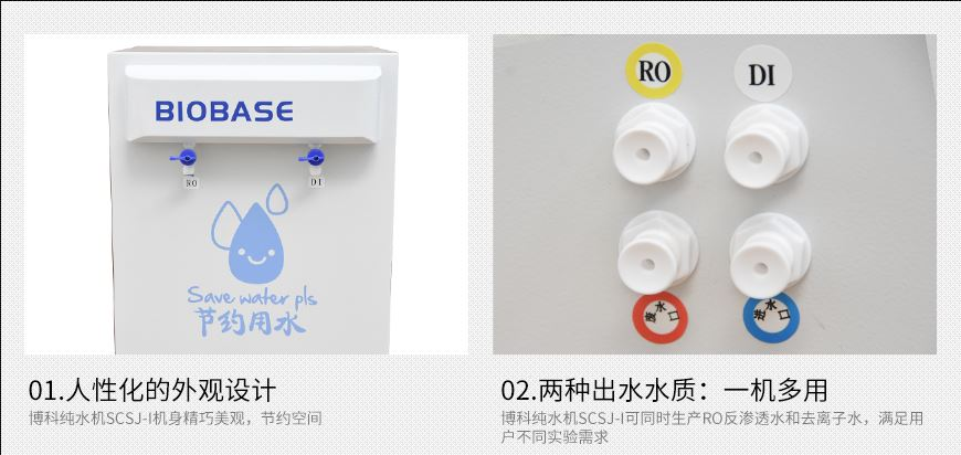3.双出水口,一个反渗透水出水口,去离子出水口,一机两用,清洗实验器皿的时候用反渗透水可减少纯化柱损耗,节约维护成本;