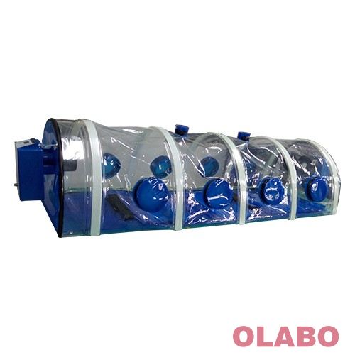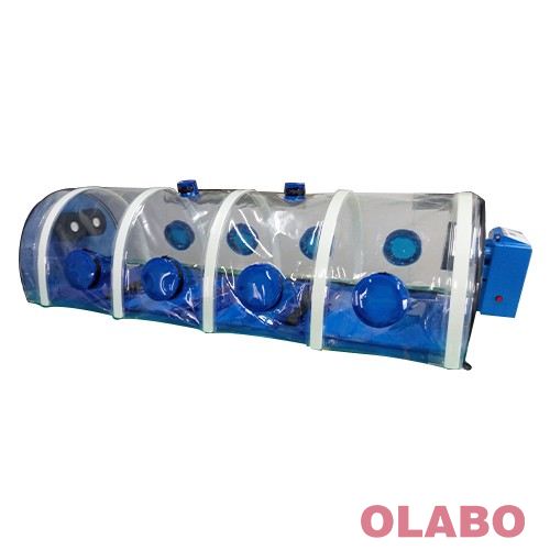 由支撑杆支撑为拱形,2个输氧口,为病员输液和输氧气;附10或6个操作口,套上手套便于对里边病人进行护理维护