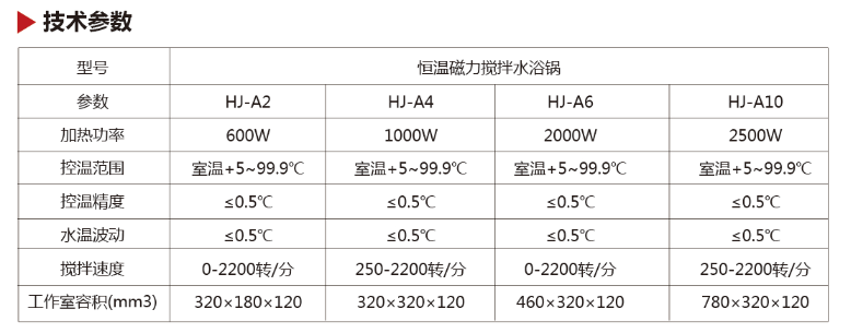 HJ-A4磁力搅拌恒温水浴锅选用进口不锈钢板和精密机械加工工艺制造,具有耐高温、耐腐蚀的特点。控温装置采用高稳定性运算放大器和双积分高精度A/D转换技术,远红外加热技术设计而成。产品热平衡时间短,温度均匀性好,不超过±0.5℃。测试数据LED显示,直观。