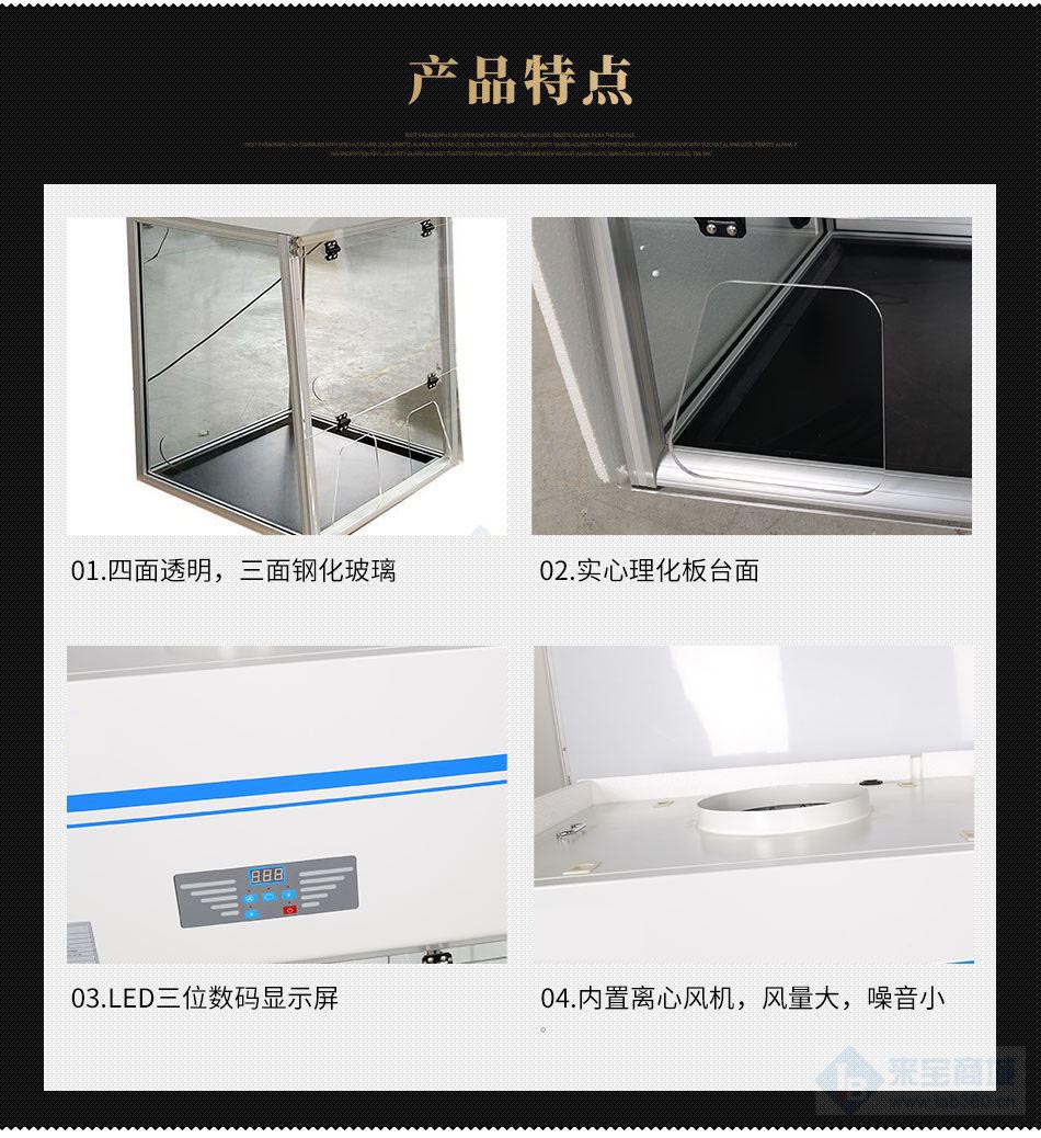 2、通风柜操作区三面钢化玻璃,有较高的美观性;台面板采用实心理化板,能够拆卸便于清理。