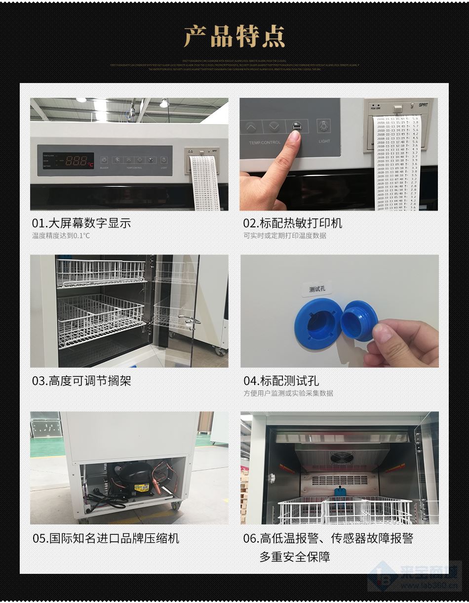 (1)采用微电脑控制系统,温度数字显示,可确保精确稳定的运行;精准的电子温度控制及显示,精度达到0.1℃;良好的制冷布局,保证箱内温度4±1℃;