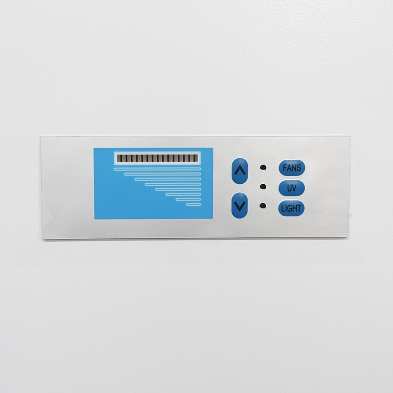 1.8控制面板采用轻触式开关,按键由风机键、照明键、紫外键、电源键、风量减小键、风量增大键组成,易于操作;显示屏显示内容有:通过光柱多少显示风机的风速;