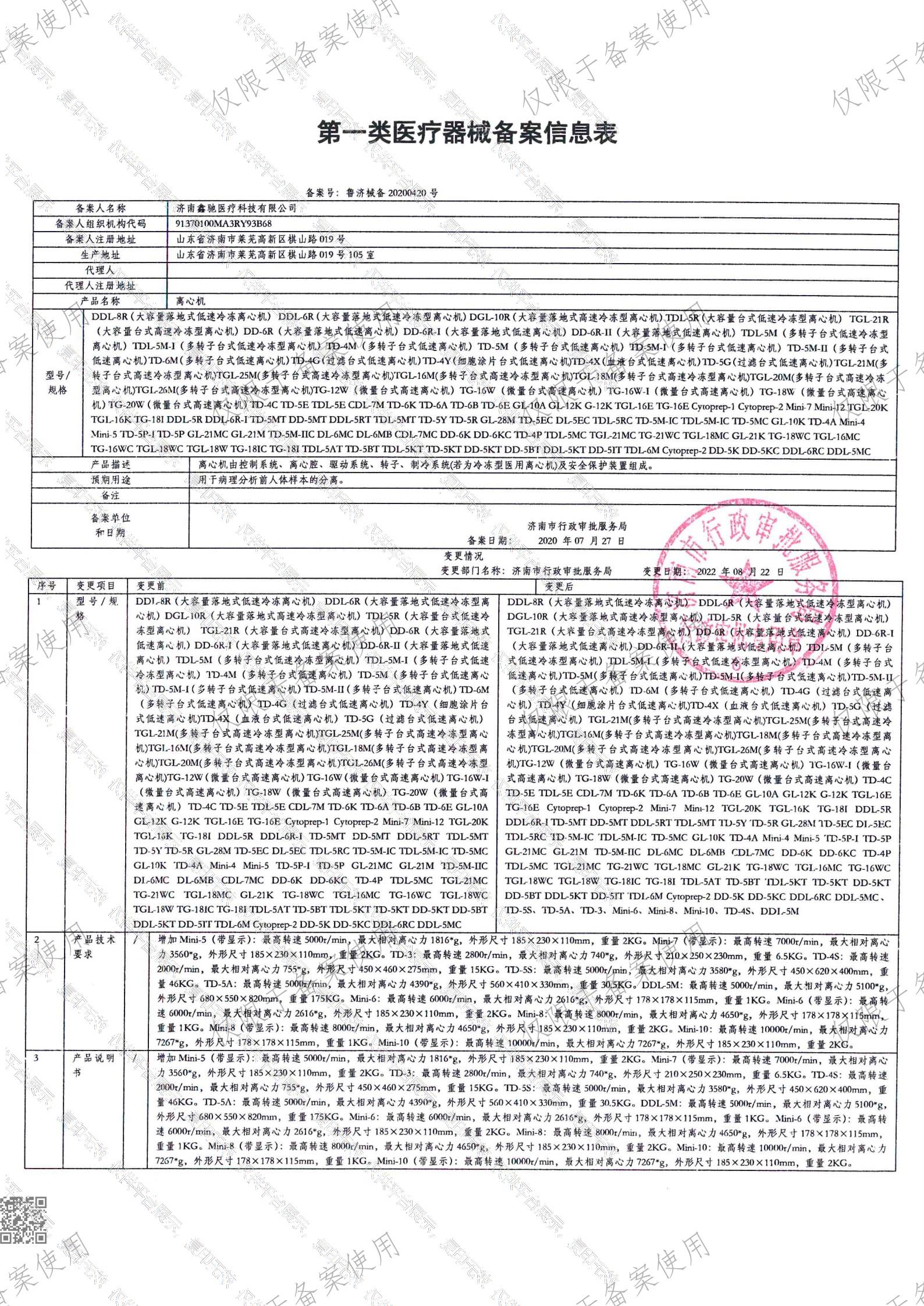 所属类目:一类 6841 医用化验和基础设备器具批准文号:鲁济械备20200420号