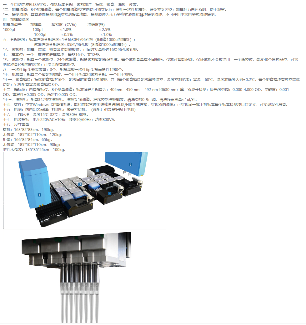 • 基本参数:4/8个加样通道,12个温育板位,一次性加样系统,最大检测样本量192个,最多可同时检测12个项目