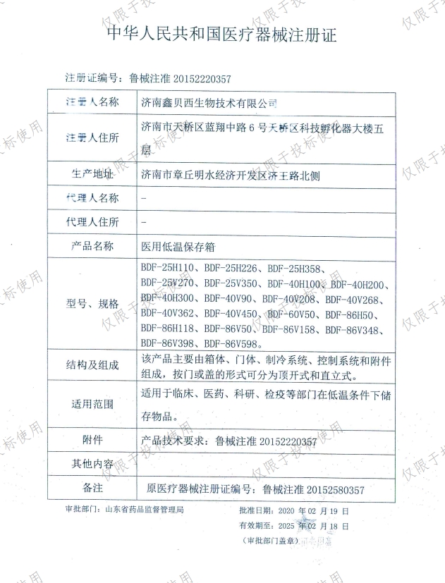 所属类目:II类6858医用冷疗、低温、冷藏设备及器具 批准文号:鲁械注准20152220357